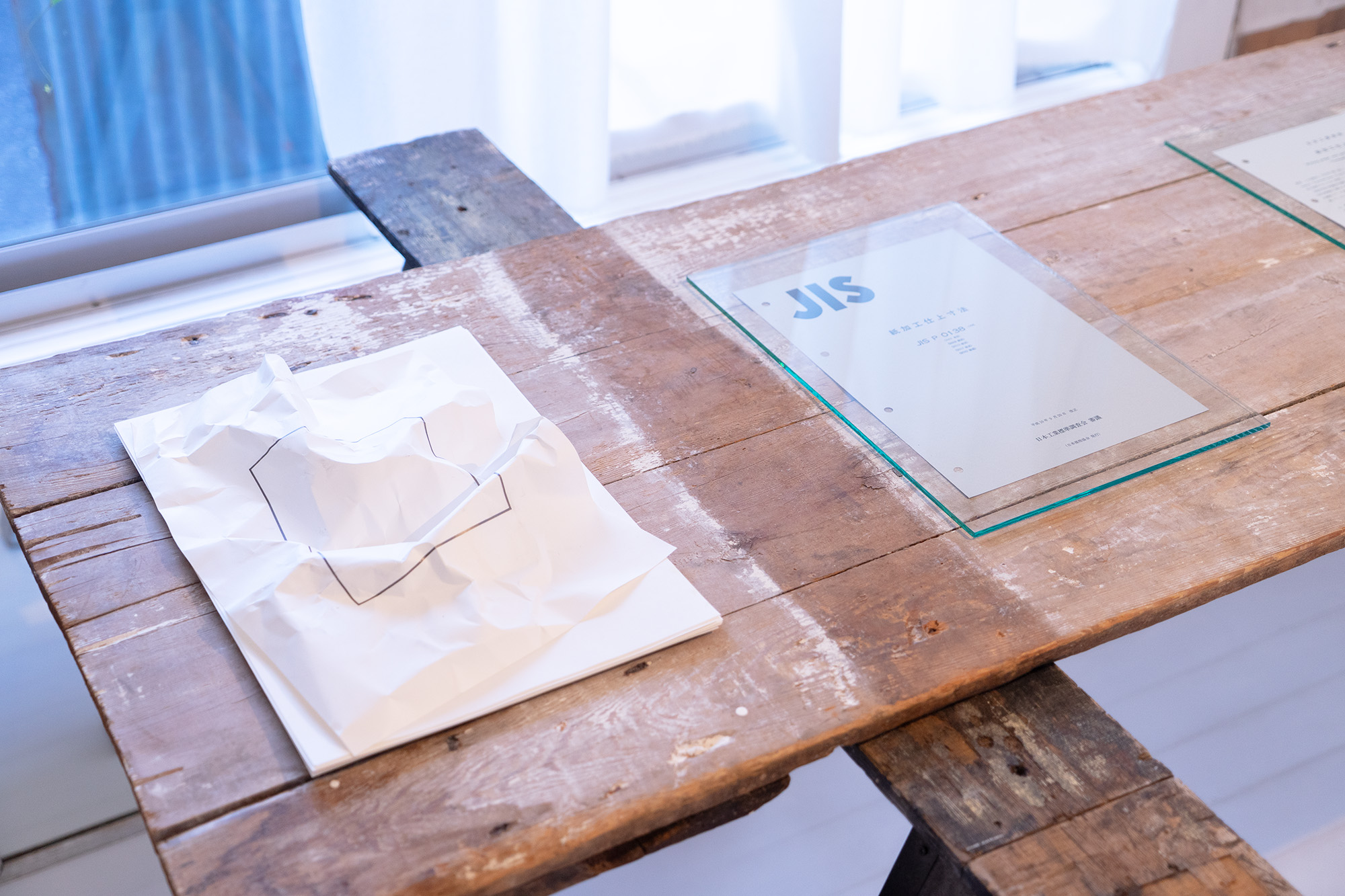 JISとは日本産業規格の略称であり、本展は紙の加工寸法(A4サイズ、B5サイズetc)に着目した展示である。